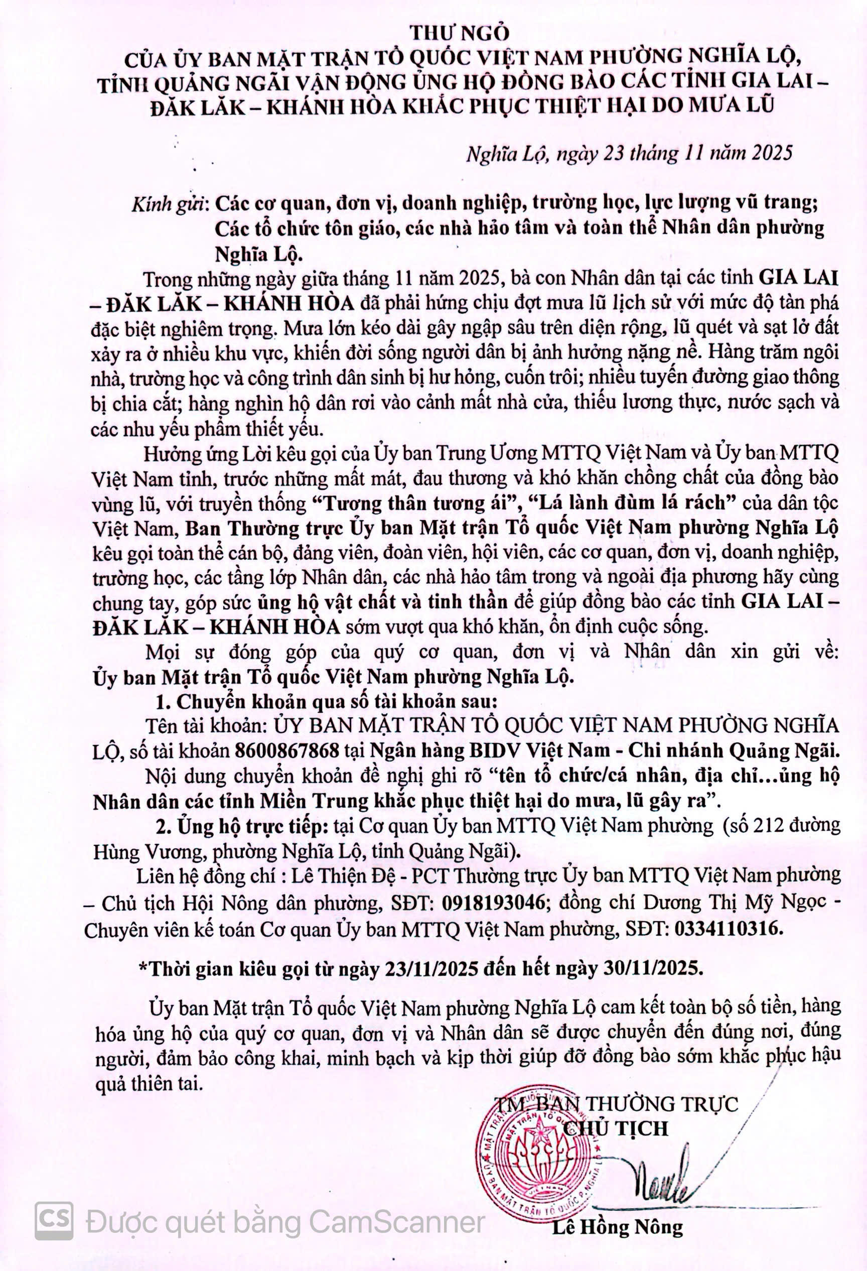 Trường THCS Lê Hồng Phong cam kết sẽ chuyển toàn bộ số tiền và hiện vật ủng hộ cho UBMT Tổ quốc Việt Nam phường Nghĩa Lộ theo Thư ngỏ nêu trên, đồng thời sẽ công khai trên cổng thông tin điện tử và các nhóm zalo của đơn vị.