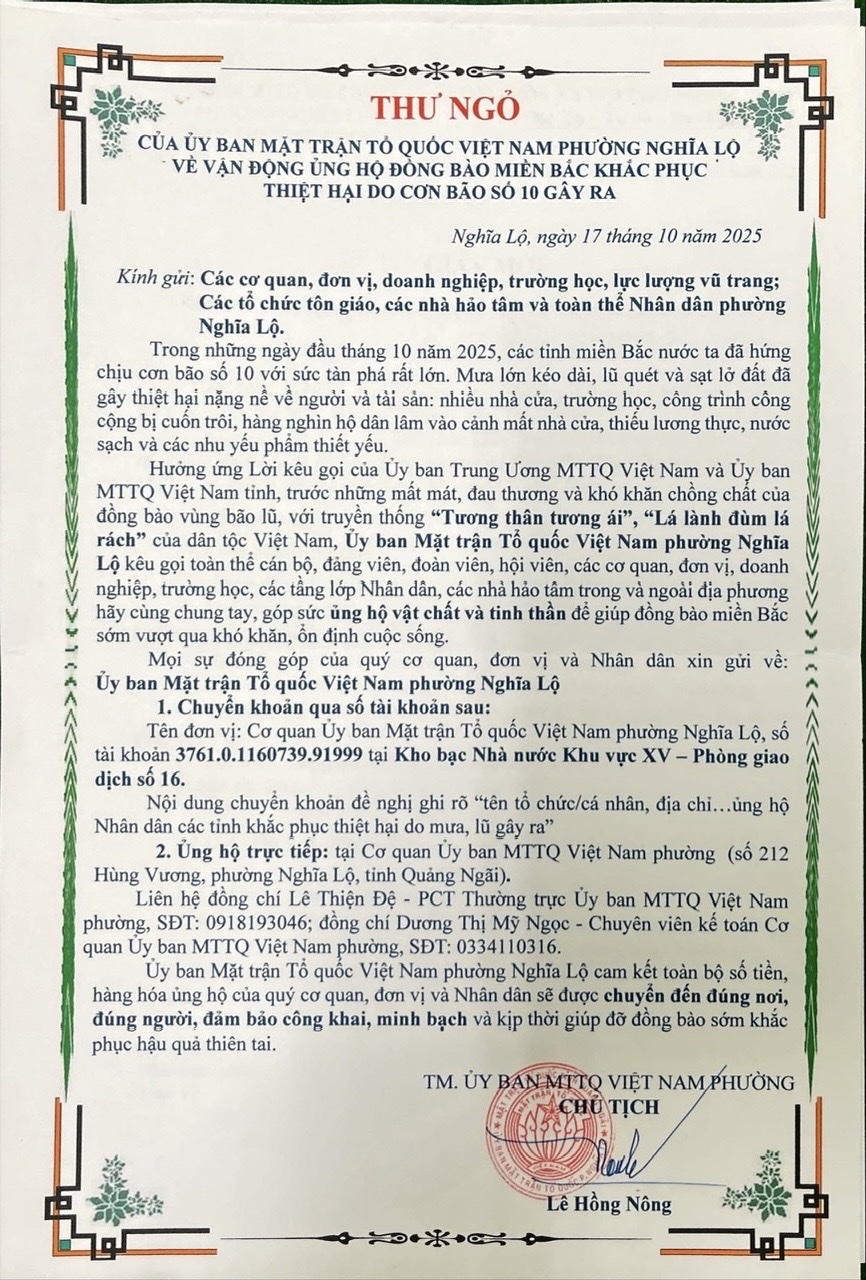 CỦA ỦY BAN MẶT TRẬN TỔ QUỐC VIỆT NAM PHƯỜNG NGHĨA LỘ VỀ VẬN ĐỘNG ỦNG HỘ ĐỒNG BÀO MIỀN BẮC KHẮC PHỤC THIỆT HẠI DO CƠN BÃO SỐ 10 GÂT RA